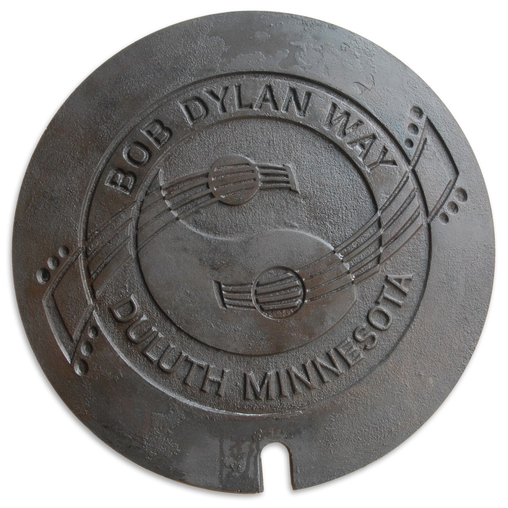 In 2011 on Bob Dylan’s 70th birthday, two Dylan-themed manhole covers were installed along this route. The first is located at the intersection of Bob Dylan Way (Michigan Street at this point) and Fifth Avenue East. Designed by Laurel Sanders, the concept was derived from Dylan’s song “Subterranean Homesick Blues.”